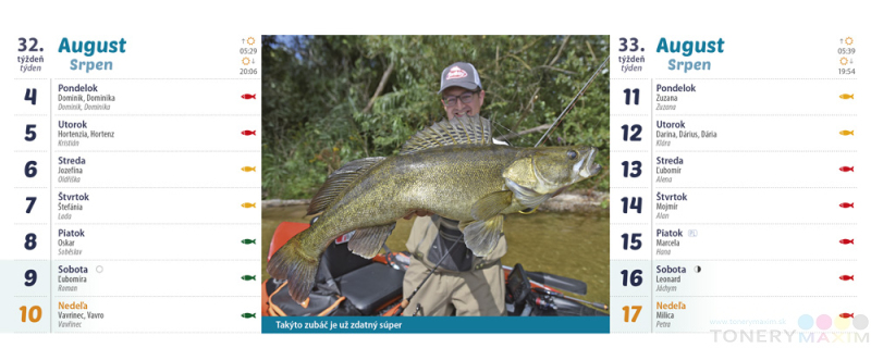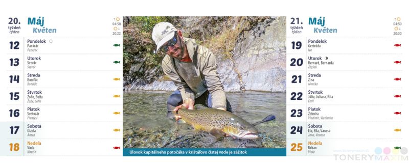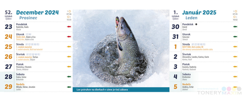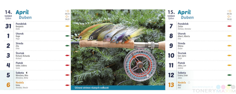 Praktický rybársky dvojtýždňový stolový kalendár s aktivitou rýb na celý rok, so zákonnými lovnými mierami najbežnejších rýb a časom ich individuálnej ochrany. Obsahuje aj prehľad celoročne chránených rýb a denný čas lovu rýb podľa typov vôd. 28 reálnych fotografií úlovkov z rôznych revírov. Slovensko-české riadkové kalendárium s menami, štátnymi sviatkami, východmi a západmi Slnka a fázami Mesiaca. Kalendár je pripravený v spolupráci s časopisom Slovenský RYBÁR.