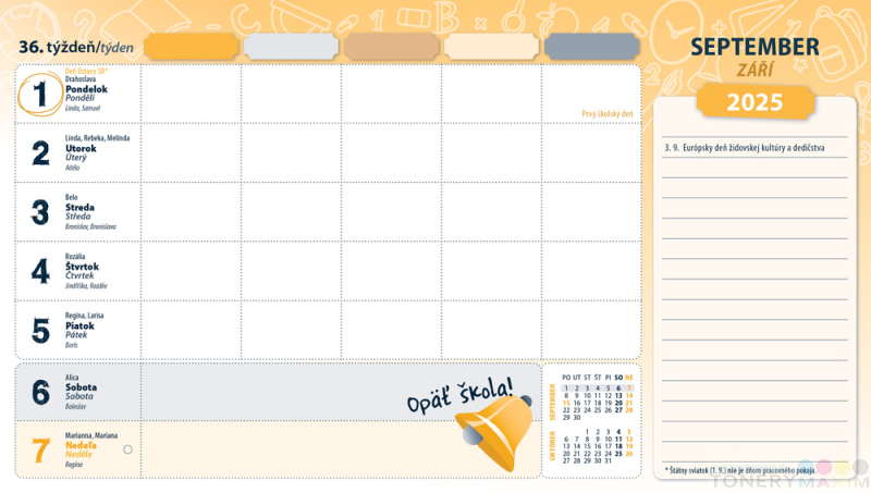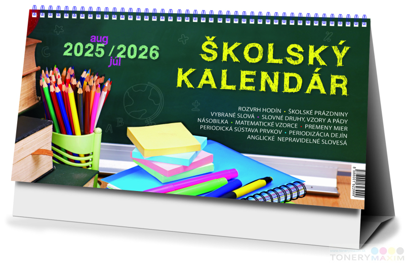 Netradičný kalendár s veľmi tradičnou témou – ŠKOLA. Týždňový stolový kalendár na obdobie školského roka (od augusta do júla) má prehľadné stĺpcové kalendárium na pripomienky či poznámky pre viacerých členov rodiny. Na prvých stranách nájdete rozvrh hodín, “ťaháky“ zo slovenského jazyka, matematiky, fyziky, chémie, angličtiny a dejepisu. Kalendár obsahuje slovenské a české mená a sviatky, pripomienky na pamätné dni a najdôležitejšie sviatky, vybrané medzinárodné a svetové dni, hlášky učiteľov a žiakov a termíny školských prázdnin.