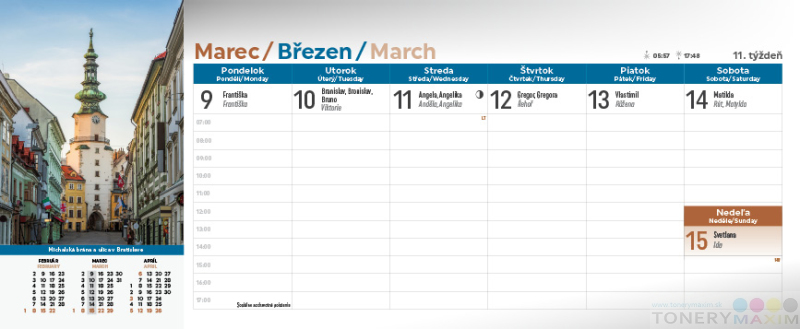 Spoznajte krásy Slovenska prostredníctvom stolového kalendára Slovensko. Týždňový stĺpcový kalendár s hodinovým delením, daňovými pripomienkami, fázami Mesiaca, východmi a západmi Slnka, štátnymi sviatkami všetkých krajín EÚ, školskými prázdninami, slovenskými a českými menami (plus netradičné mená).