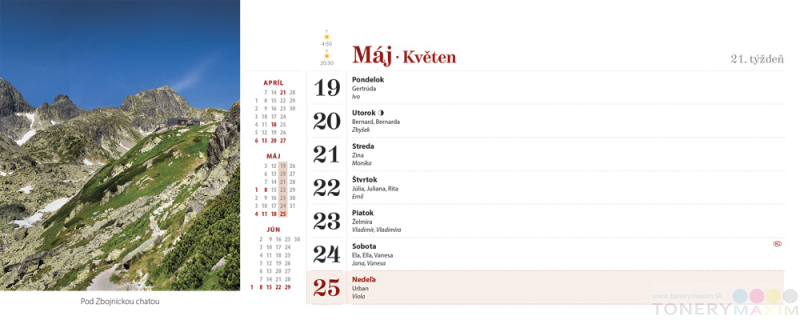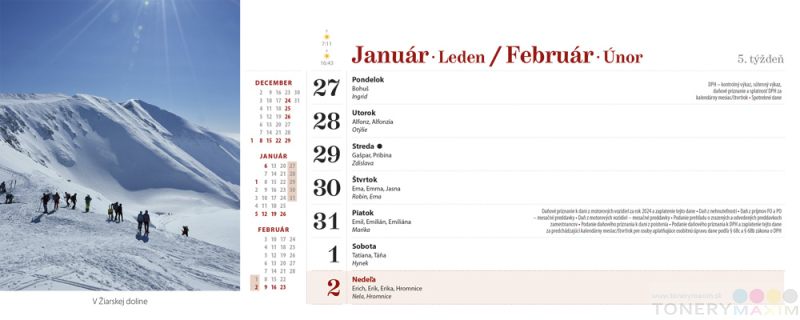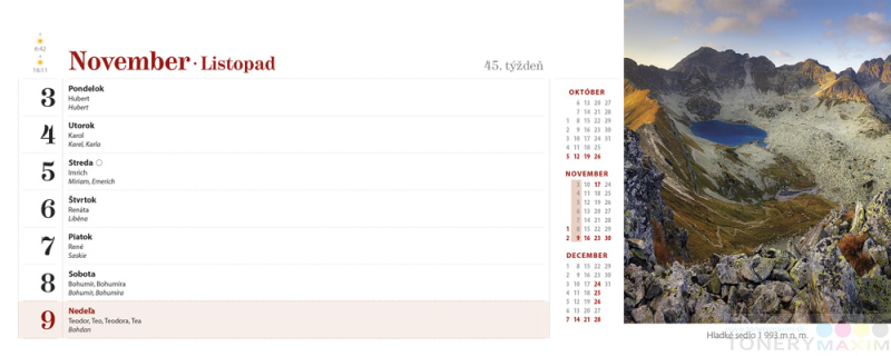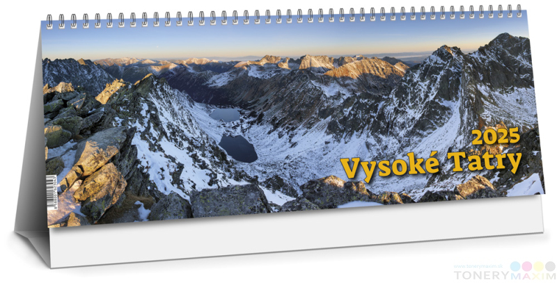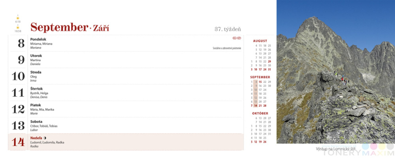 Tatranské štíty, príroda a ľudia, zachytené v stolovom týždňovom kalendári s riadkovým delením, daňovými pripomienkami, fázami Mesiaca, východmi a západmi Slnka, štátnymi sviatkami všetkých krajín EÚ, školskými prázdninami, slovenskými a českými menami (plus netradičné mená).