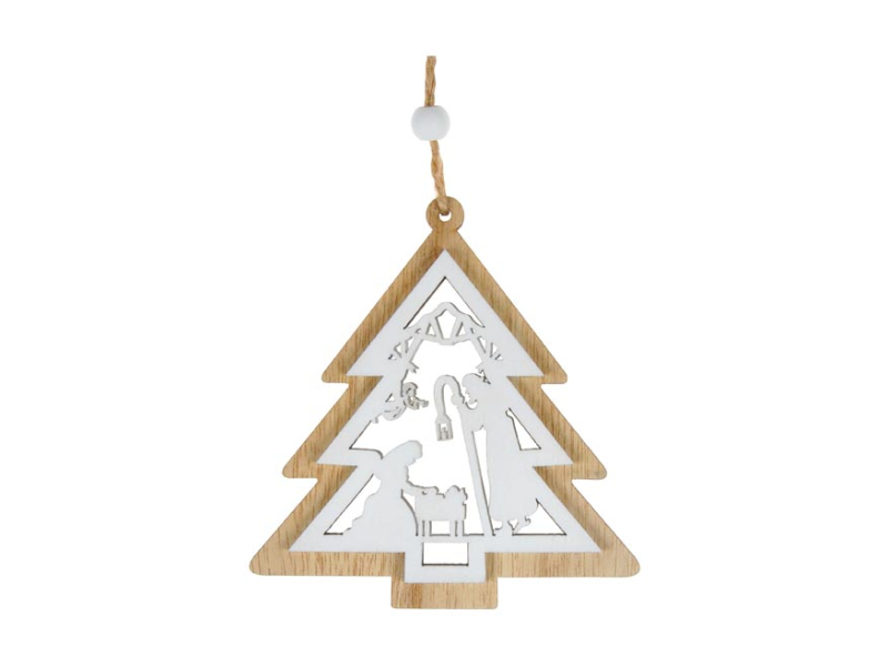 Drevená vianočná dekorácia v tvare vianočného stromčeka. Uprostred stromčeka je vyobrazenie Ježiška v kolíske.