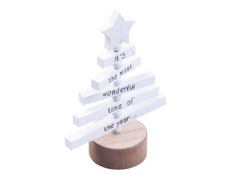 Vianočná drevená dekorácia na postavenie, stromček v bielej farbe s nápisom „It's the most wonderful time of the year“. Jednotlivé poschodia stromčeka sú otočné a môžete si ich ozdobiť podľa svojich predstáv. Táto originálna dekorácia vám pomôže vytvoriť čarovnú vianočnú atmosféru. Farba: biela Materiál: drevo Uvedená cena je za 1 ks.