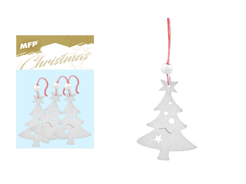 Drevený vianočný stromček so šnúrkou na zavesenie. Táto vianočná dekorácia je striebornej farby. Môžete ju použiť na ozdobenie vianočného stromčeka, zavesiť na dvere, na okno, alebo ináč skrášliť vaše bývanie. Balené vo vrecúšku so závesom, balenie obsahuje 3 ks.
