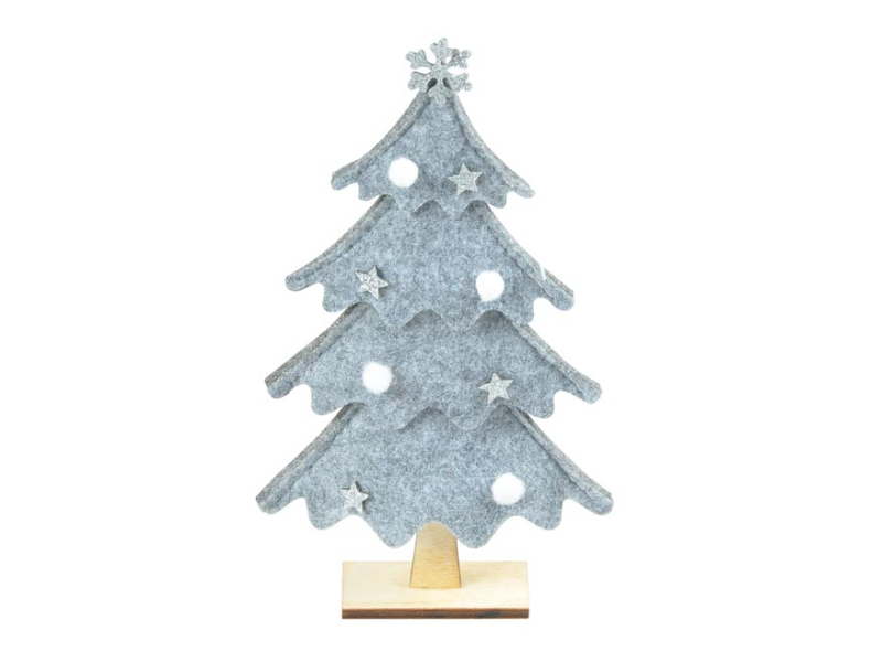 Filcový strom, sivý. Krásna vianočná dekorácia v dizajne sivého stromčeka slúži ako dekorácia nielen v interiéri, ale aj v exteriéri. Táto krásna dekorácia navodí vianočnú atmosféru. Rozmery: 220 mm Uvedená cena je za 1 ks.