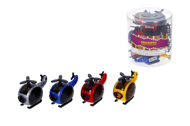 Orezávatko na jednu ceruzku so zásobníkom - helikoptéra. Farba: šedá, modrá, červená, žltá Dodávame podľa skladovej zásoby. Uvedená cena je za 1 ks.