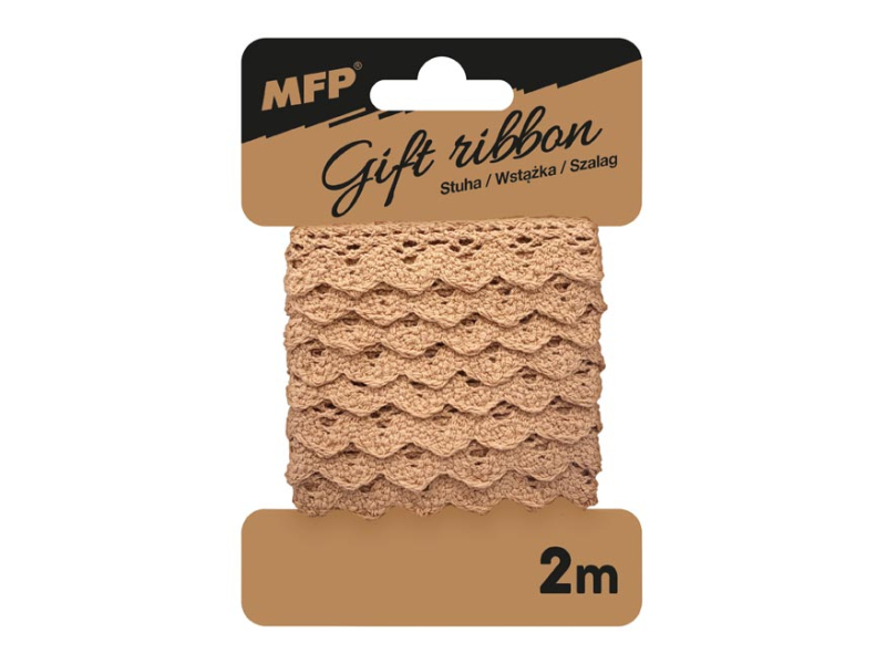 Čipková, bavlnená stuha v hnedej farbe. Je vhodná na svadobné dekorácie, ručné šitie, zdobenie odevov, balenie darčekov alebo viazanie kvetov. Čipkovaná stuha je opakovane použiteľná. Dĺžka: 2 m Farba: hnedá Uvedená cena je za 1 ks.