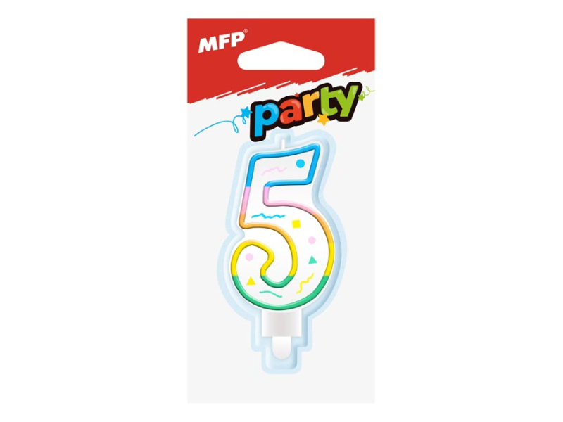 Tortová sviečka v tvare čísla 5. Sviečka má duhový potisk z prednej strany. Kúpte oslávencovi tortové sviečky, ktoré dozdobia už tak dokonalú tortu a splnia oslávencovi jeho tajné prianie! VAROVANIE: Slúži ako dekorácia, nie je hračka, nie je určené na konzumáciu! Pri manipulácii s otvoreným ohňom dbajte na zvýšenú opatrnosť, nevystavujte prievanu. Sviečku postavte zvisle na nehorľavý podklad. Nenechávajte horieť bez dohľadu. Nutná stála prítomnosť dospelej osoby! Dodávame v plastovom obale so závesom. Uvedená cena je za 1 ks.