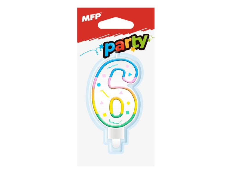 Tortová sviečka v tvare čísla 6. Sviečka má duhový potisk z prednej strany. Kúpte oslávencovi tortové sviečky, ktoré dozdobia už tak dokonalú tortu a splnia oslávencovi jeho tajné prianie! VAROVANIE: Slúži ako dekorácia, nie je hračka, nie je určené na konzumáciu! Pri manipulácii s otvoreným ohňom dbajte na zvýšenú opatrnosť, nevystavujte prievanu. Sviečku postavte zvisle na nehorľavý podklad. Nenechávajte horieť bez dohľadu. Nutná stála prítomnosť dospelej osoby! Dodávame v plastovom obale so závesom. Uvedená cena je za 1 ks.