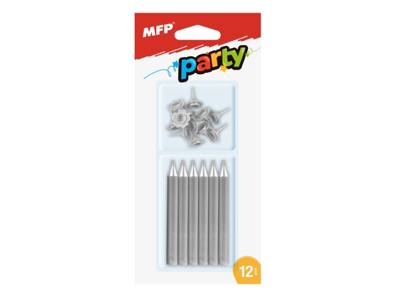 Sada sviečok na tortu - strieborná farba. Sfúknutie sviečok na torte je nevyhnutnou súčasťou osláv narodenín. Ponúkame sviečky na tortu v niekoľkých farbách a tvaroch. Nájdete u nás aj obľúbené tortové fontány. BALENIE OBSAHUJE: - 12 sviečok - 12 plastových držiakov UPOZORNENIE: Dekorácia, nie hračka, nie je určená na konzumáciu! Pri manipulácii s otvoreným ohňom dbajte na zvýšenú opatrnosť, nevystavujte prievanu. Sviečku umiestnite vo zvislej polohe na nehorľavý podklad. Nenechávajte horieť bez dozoru. Dospelá osoba musí byť vždy prítomná! Sviečky sú balené v blistri so závesom. Uvedená cena je za 1 balenie.