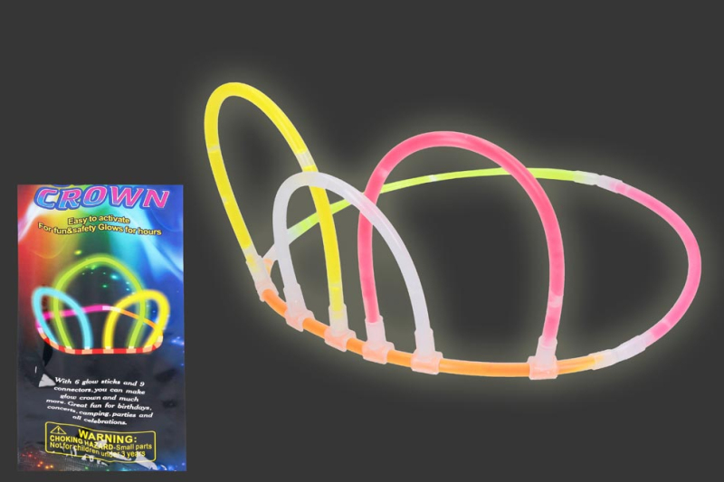 Svietiaca korunka. Obsahuje svietiace tyčinky a spojky. NÁVOD NA POUŽITIE: Tyčinku ohnite, spojte a pretrepte. Tyčinku neprepichujte, nelámte ani nijako nedeformujte. Nedávajte do úst, nehryzte, tekutinu nepite! Tekutina je netoxická, zdraviu neškodná, ale pri vniknutí do očí môže dráždiť. V takom prípade dôkladne prepláchnite čistou vodou. VAROVANIE: Nevhodné pre deti do 3 rokov, nebezpečenstvo prehltnutia malých častí. Odporúčaný vek je od 5 rokov. Pri používaní deťmi je nutný trvalý dozor dospelej osoby. Uvedená cena je za 1 balenie.