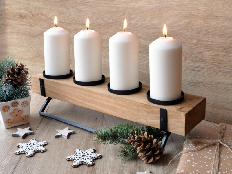 Luxusný, adventný svietnik v kombinácii dreva a kovu. Sviečnik je tradične určený na štyri adventné sviečky. Zapáľte každú adventnú nedeľu jednu sviečku a vytvorte si pocit vianočného pokoja a pohody. Priemer pohára na sviečku: 80 mm Uvedená cena je za 1 ks.