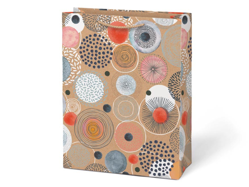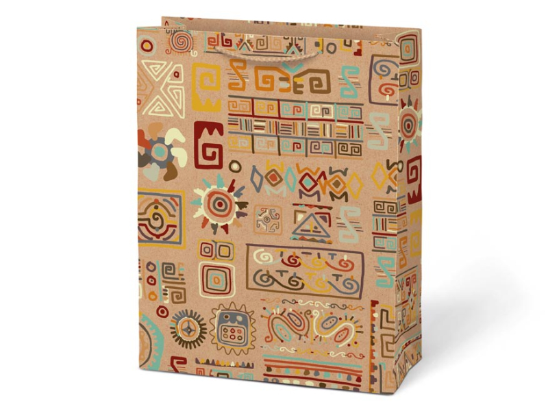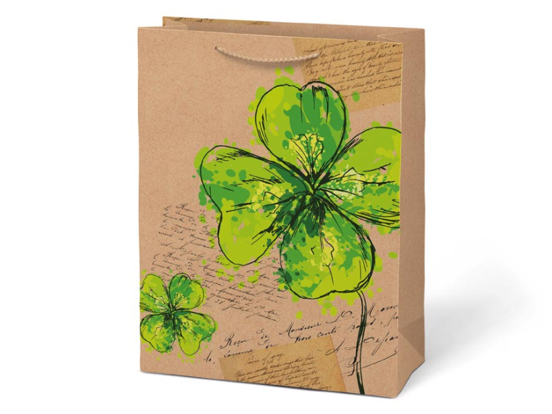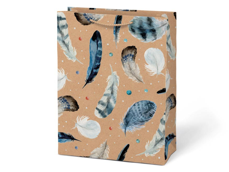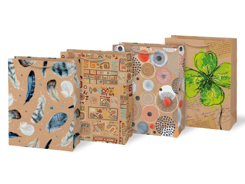 Darčeková taška L KRAFT z pevného kraftového papiera s farebnou potlačou. Taška má pletené textilné uši a kartičku kam môžete napísať meno alebo krátke venovanie. Pokiaľ nemáte čas baliť darček do darčekového baliaceho papiera tak práve pre Vás máme široký výber darčekových tašiek. MOTIV: - pierka - kolieska - štvorlístok - ornamenty Farba: hnedá/prírodná Materiál: kraftový papier Rozmer: 260 x 340 x 140 mm Dodávame v mixe po 4 ks podľa skladovej zásoby. Uvedená cena je za 1 ks.