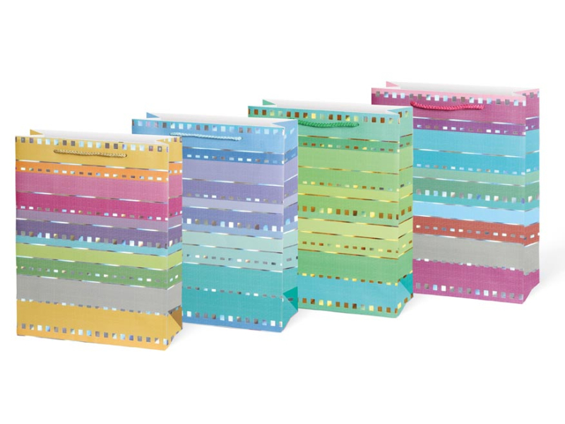 Farebná, darčeková, papierová taška L LUX s moderným, farebným dizajnom. Taška je zabezpečená pevným uchom pre lepšie nosenie a kartičkou kam si môžeme napísať meno alebo krátke venovanie. Darčekové tašky sú skvelé na darčeky, ktoré iba ťažko zabaliť do baliaceho papiera. Veľmi praktické sú preto pre tých, čo darčeky neradi balia alebo to moc nevedia a neboli by spokojní so svojim výsledkom. Motív: pruhy Rozmer: 260 x 320 x 100 mm Dodávame v mixe po 4 ks podľa skladových zásob. Uvedená cena je za 1 ks.