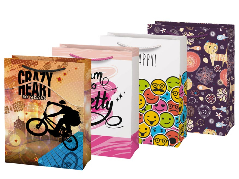 Papierová, darčeková taška. Každý darček musí byť v niečom zabalený. Ak nemáte čas baliť ho do baliaceho papiera, máme pre vás na výber najrôznejšie darčekové tašky. Taška má pevné ucho na ľahké prenášanie a štítok na meno a želanie. MOTÍVY: - nápis „I am so pretty“ - biker - zvieratá (mačky a rybky) - smajlíky Rozmer: 190 x 250 x 90 mm Dodávame v mixe po 4 ks podľa skladových zásob. Uvedená cena je za 1 ks.