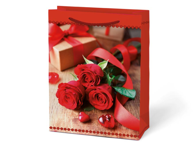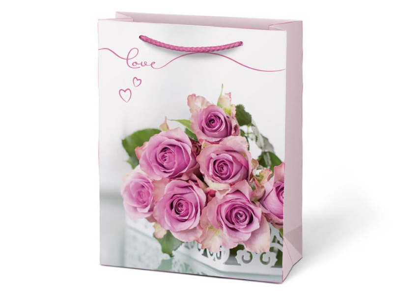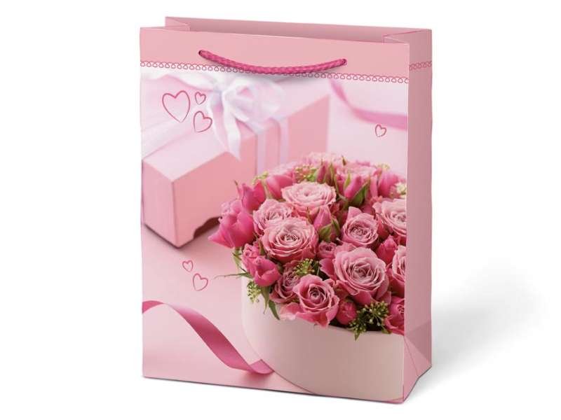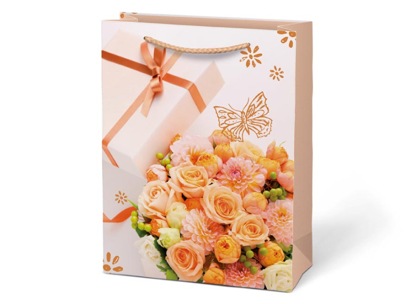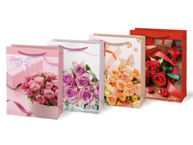 Papierová, darčeková taška T4. Každý darček musí byť do niečoho zabalený. Ak nemáte čas zabaliť ho do baliaceho papiera, máme pre vás na výber rôzne darčekové tašky. Taška má pevnú rukoväť na jednoduché prenášanie a štítok na napísanie mena alebo kartičky. Motív: kytica ruží Rozmery: 190 x 250 x 90 mm Dodáva sa v mixe 4 ks podľa skladových zásob. Uvedená cena je za 1 ks.