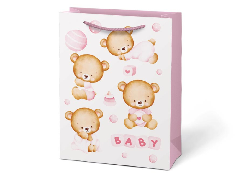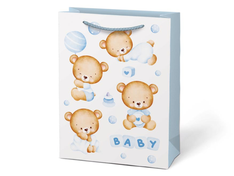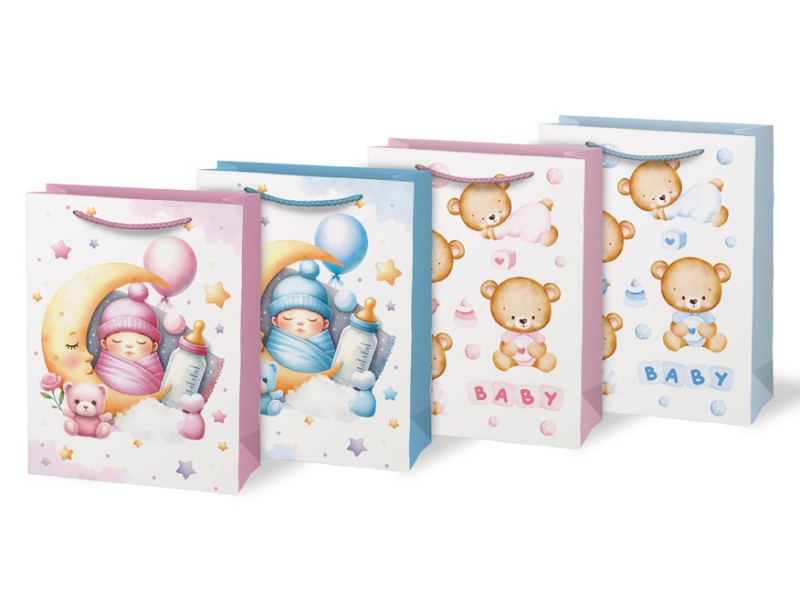 Papierová darčeková taška T4 s detskými motívmi. Na výber sú dva dievčenské a dva chlapčenské motívy. Je ideálna na obdarovanie pri príležitostiach, ako sú detské oslavy, krstiny alebo detské párty. Táto darčeková taška dodá vášmu darčeku špeciálny a láskyplný nádych. Darček novým rodičom odovzdáte v elegantnom a roztomilom balení. Rozmery: 190 x 250 x 100 mm Motív: dievčenské, chlapčenský Dodávame v mixe 4 ks podľa skladových zásob. Uvedená cena je za 1 ks.