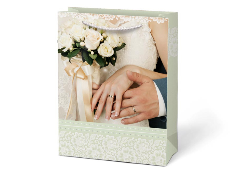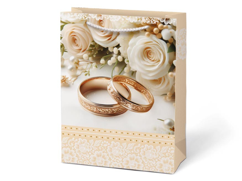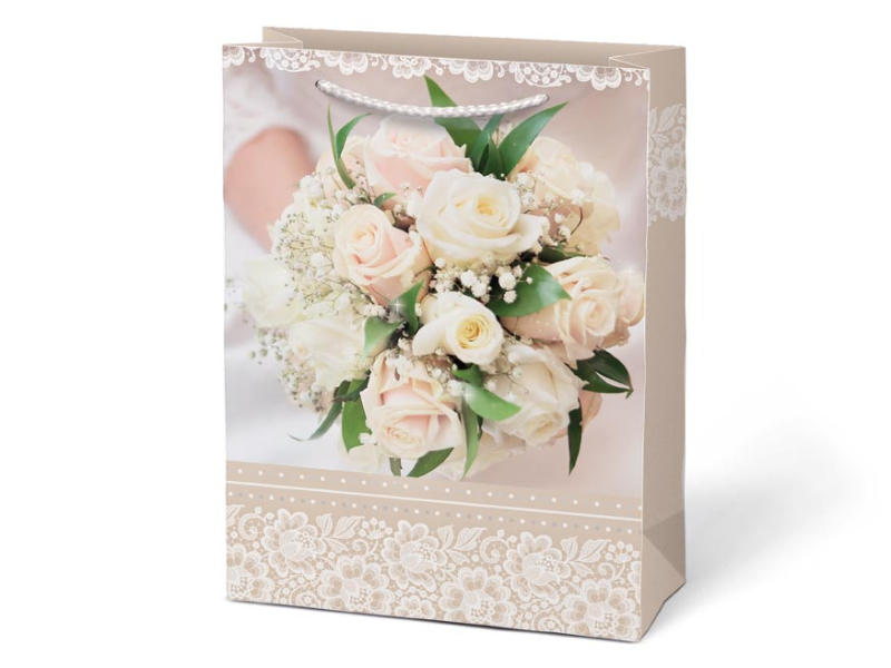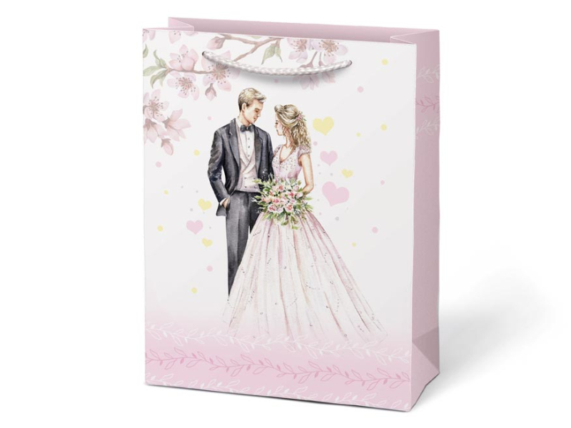 Papierová darčeková taška T4 so svadobným motívom. Predstavujeme vám našu exkluzívnu svadobnú tašku, ktorá je určená na elegantnú a štýlovú prezentáciu darčekov pre novomanželov. Výberom darčekovej tašky namiesto baliaceho papiera môžete ušetriť čas a zvýšiť estetickú hodnotu daru. Darčeková taška umožňuje rýchle a jednoduché zabalenie darčeka bez potreby zdĺhavého baliaceho papiera. Motív: svadbobný Rozmery: 190 x 250 x 100 mm Dodávame v mixe 4 ks podľa skladových zásob. Uvedená cena je za 1 ks.