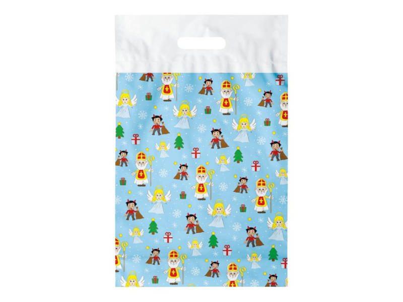 Igelitová taška s priehmatom s mikulášskym motívom. Na taške je obrázok Mikuláša, anjela, čerta, vianočných darčekov a stromčeka. Materiál: PE Rozmery: 290 x460 x 80 mm Praktické balenie – odtrhávací blok Všetkých 50 ks je balených v sáčku. Uvedená cena je za 1 ks.
