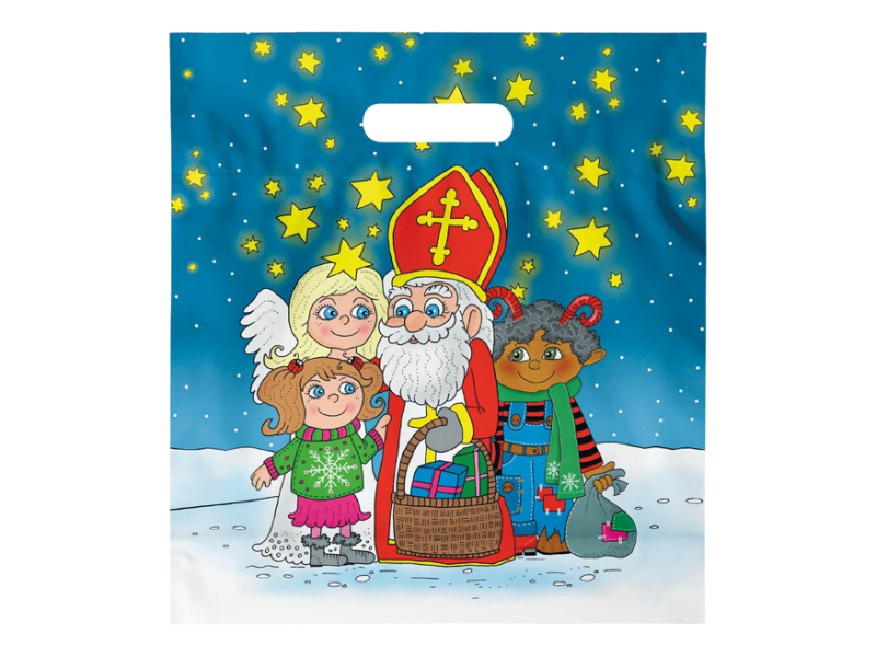 Igelitová taška s priehmatom s mikulášskym motívom. Na taške je obrázok Mikuláša, anjela, čerta a vianočných darčekov. Materiál: PE Rozmery: 295 x 32 x 80 mm Uvedená cena je za 1 ks.