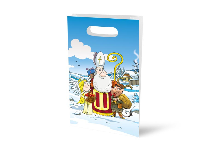 Vianočná papierová taška s priehmatom a farebnou potlačou Mikuláša, anjela a čerta. Ideálna na zhotovovanie čokoládových balíčkov pre deti. Rozmer: 190 x 340 x 60 mm Uvedená cena je za 1 ks.