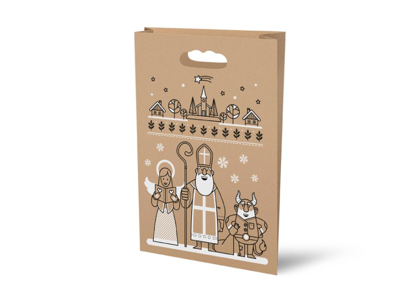 Vianočná papierová taška s priehmatom a čierno-bielou potlačou Mikuláša, anjela a čerta. Ideálna na zhotovovanie čokoládových balíčkov pre deti. Rozmer: 260 x 410 x 110 mm Uvedená cena je za 1 ks.