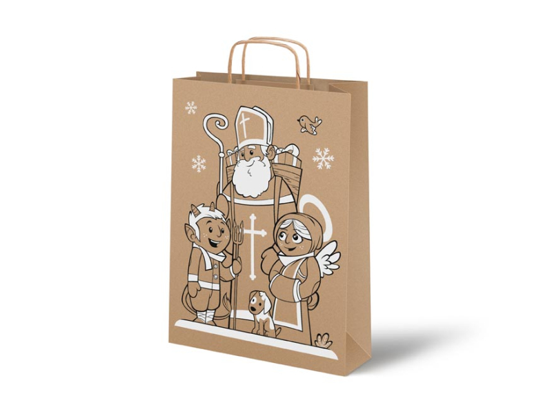 Darčeková, papierová taška s prehmatom a potlačou Mikuláša, anjela a čerta. Ideálna na vytváranie čokoládových balíčkov pre deti! Kartónové balenie: 300 ks Materiál: hnedý papier 70 g Rozmer: 220 x 280 x 100 mm Uvedená cena je za 1 ks.