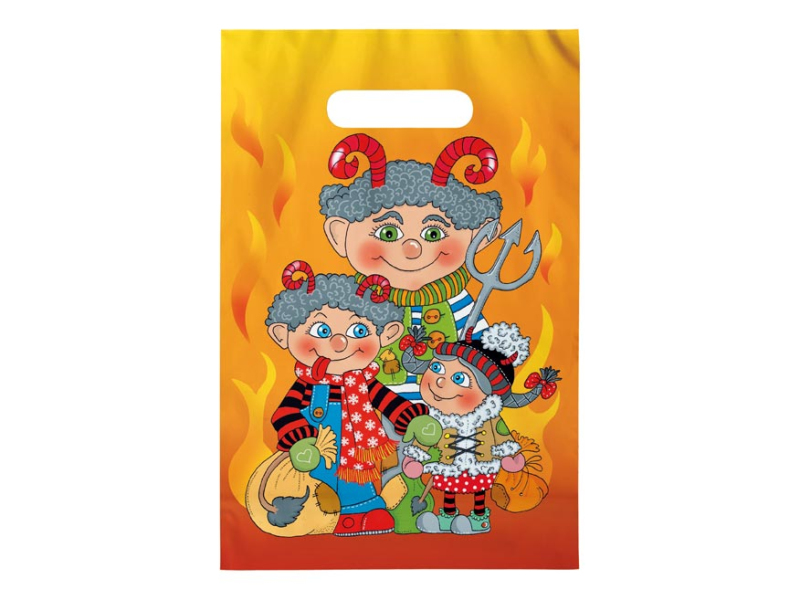 Igelitová taška s prehmatom v Mikulášskom motíve, ktorá je ideálna na zabalenie dobrôt, sladkostí a na ďalšiu mikulášsku nádielku pre deti. Na taške je obrázok troch čertov. Materiál: PE Rozmer: 200 x 300 x 80 mm Praktické balení - odtrhávací blok Všetkých 50 ks je balených v sáčku. Uvedená cena je za 1 ks.
