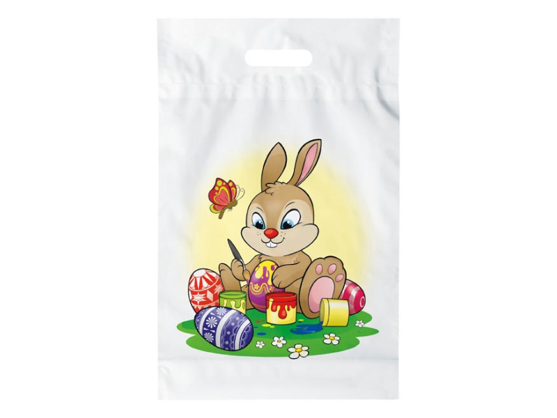 Igelitová taška s motívom veľkonočného zajačika. Ideálna na prípravu čokoládových balíčkov pre deti. Tlač: 4+0cmyk Materiál: polyetylén Hrúbka materiálu: 0,045 my Uvedená cena je za 1 ks.
