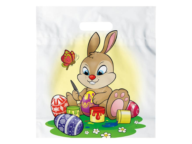 Igelitová taška s motívom veľkonočného zajačika. deálna na prípravu čokoládových balíčkov pre deti. Tlač: 4+0cmyk Materiál: polyetylén Hrúbka materiálu: 0,045 my Uvedená cena je za 1 ks.