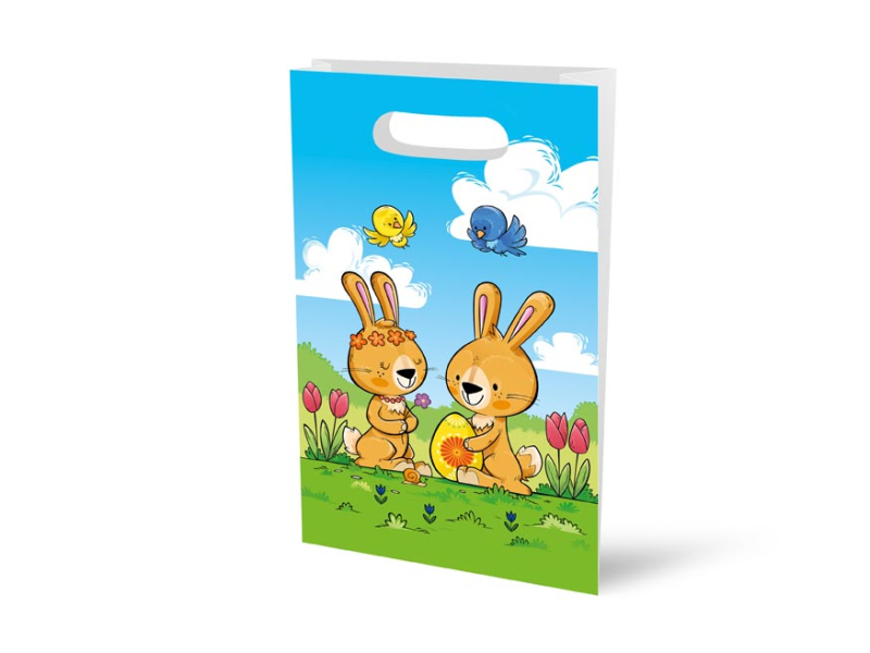 Veľkonočná papierová taška s potlačou veľkonočných zajačikov. Ideálna na vytváranie čokoládových balíčkov pre deti. Materiál: papier Uvedená cena je za 1 ks.