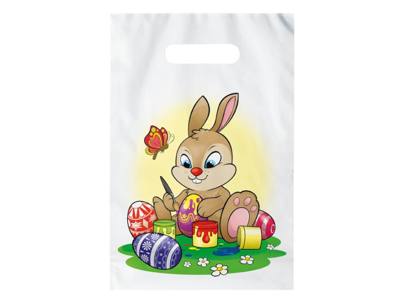 Igelitová taška s motívom veľkonočného zajačika. Ideálna na prípravu čokoládových balíčkov pre deti. Tlač: 4+0 cmyk Materiál: polyetylén Hrúbka materiálu: 0,045 my Uvedená cena je za 1 ks.