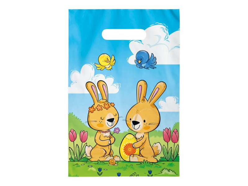 Veľkonočná igelitová taška s potlačou veľkonočných zajačikov. Ideálna na vytváranie čokoládových balíčkov pre deti. Tlač: 4+0cmyk Materiál: Polyetylén Hrúbka materiálu: 0,045 my Uvedená cena je za 1 ks.