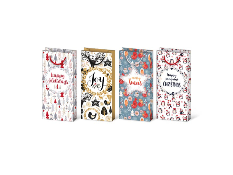 Papierová, darčeková taška s vianočnými Disney motívmi a nápismi „happy Holidays, Joe, merry Xmas, happy penguins Christmas“ – vodná na fľašku vína. Taška má pevné ucho pre ľahšie prenášanie a štítok na napísanie mena či priania. Gramáž: 157 g Povrchová úprava: Lak Rozmer: 100 x 220 x 55 mm Dodávame v mixe po 4 ks podľa skladových zásob. Uvedená cena je za 1 ks.