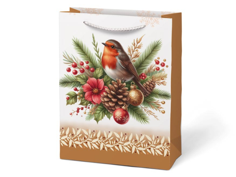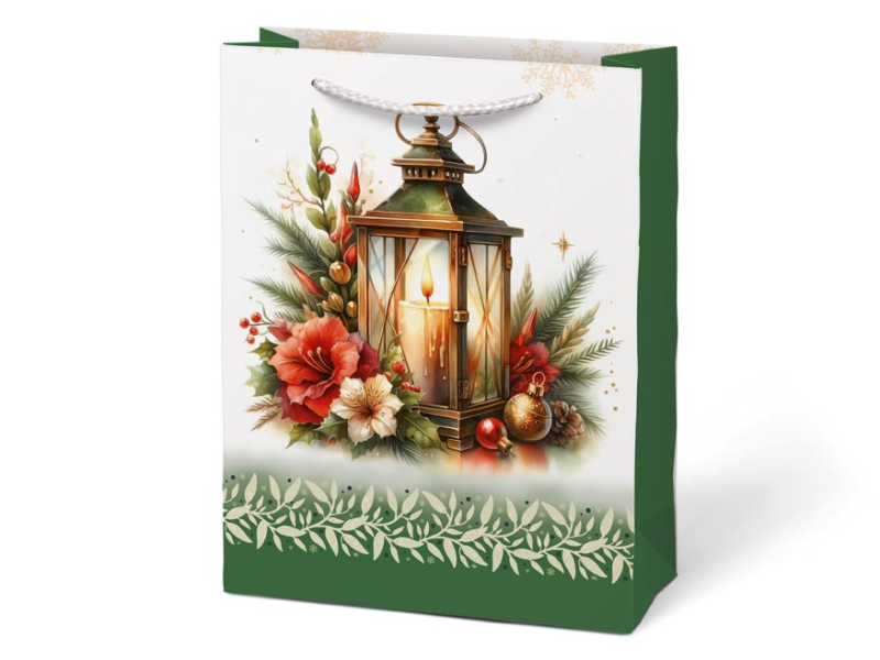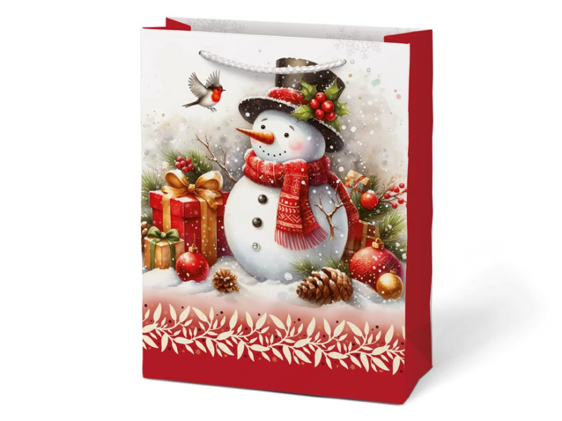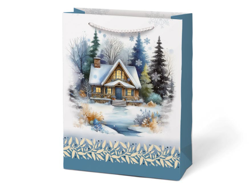 Vianočná darčeková papierová taška T4 s vianočnými motívmi je dokonalým spojením elegancie a praktickosti. Taška je vhodná na balenie všetkých druhov darčekov, od malých prekvapení po väčšie predmety, a pridáva im kúzlo sviatočnej atmosféry. Je skutočne nepostrádateľným pomocníkom, keď sa balenie darčeka do klasického baliaceho papiera zdá byť príliš ťažké. Jej robustné uši zaisťujú pohodlné a bezpečné prenášanie. Rozmer: 190 x 250 x 90 mm Motív: zasnežená chalupa, vianočná lampáš, vtáčik na vetve, snehuliak Dodávame v mixe po 4 ks podľa skladovej zásoby. Uvedená cena je za 1 ks.