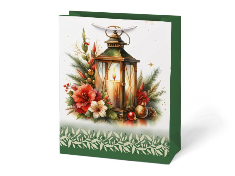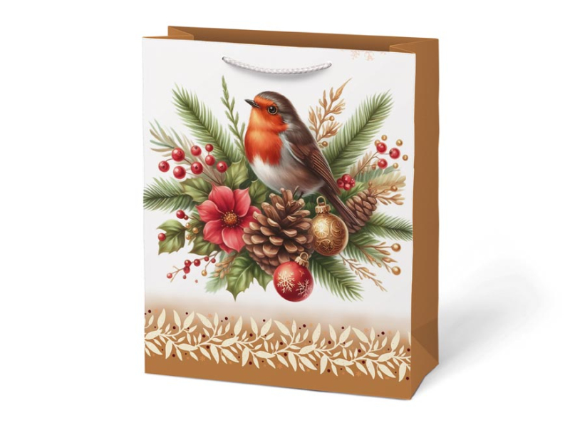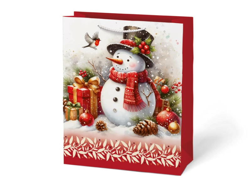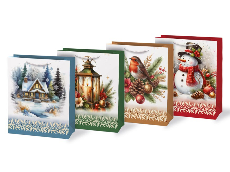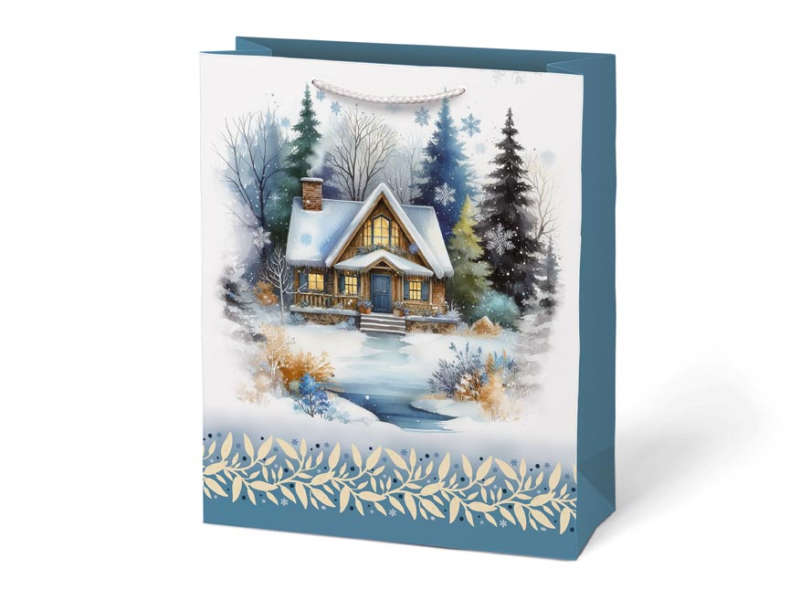 Vianočná darčeková papierová taška T5 s vianočnými motívmi je dokonalým spojením elegancie a praktickosti. Taška je vhodná na balenie všetkých druhov darčekov, od malých prekvapení po väčšie predmety, a pridáva im kúzlo sviatočnej atmosféry. Je skutočne nepostrádateľným pomocníkom, keď sa balenie darčeka do klasického baliaceho papiera zdá byť príliš ťažké. Jej robustné uši zaisťujú pohodlné a bezpečné prenášanie. Rozmer: 260 x 320 x 138 mm Motív: zasnežená chalupa, vianočná lampáš, vtáčik na vetve, snehuliak Dodávame v mixe po 4 ks podľa skladovej zásoby. Uvedená cena je za 1 ks.