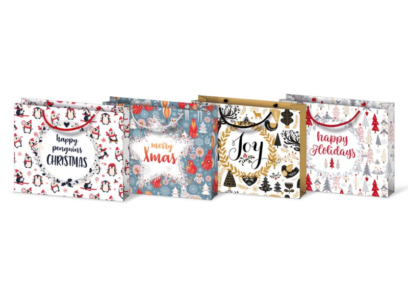 Papierová, darčeková taška s vianočnými motívmi a nápismi „happy Holidays, Joe, merry Xmas, happy penguins Christmas“. Taška má pevné ucho pre ľahšie prenášanie a štítok na napísanie mena či priania. Gramáž: 157 g Povrchová úprava: Lak Rozmer: 325 x 265 x 135 mm Dodávame v mixe po 4 ks podľa skladových zásob. Uvedená cena je za 1 ks.