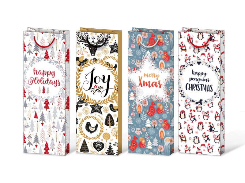 Papierová, darčeková taška s vianočnými motívmi a nápismi „happy Holidays, Joy, merry Xmas, happy penguins Christmas“. Taška má pevné ucho pre ľahšie prenášanie a štítok na napísanie mena či priania. Gramáž: 157 g Povrchová úprava: Lak Rozmer: 125 x 365 x 90 mm Dodávame v mixe po 4 ks podľa skladových zásob. Uvedená cena je za 1 ks.