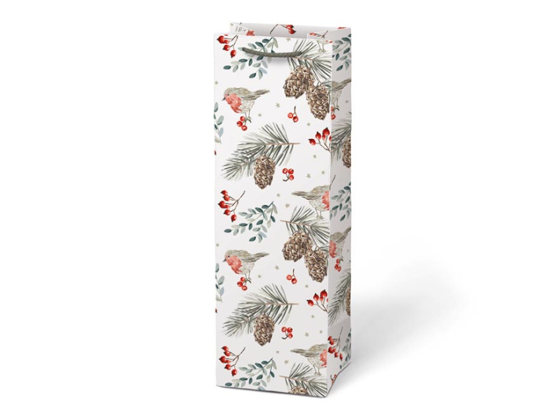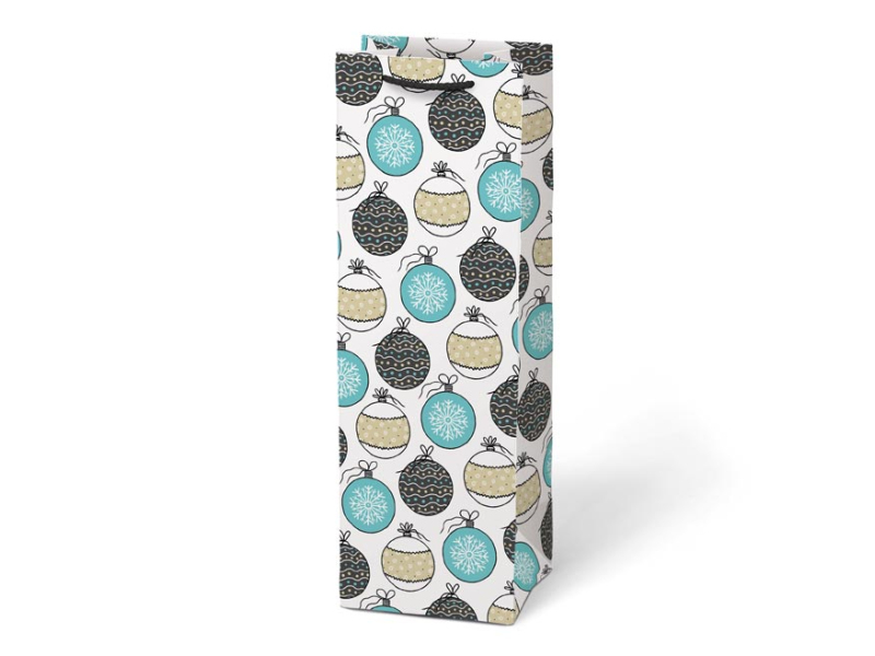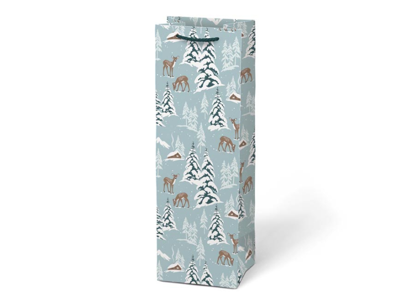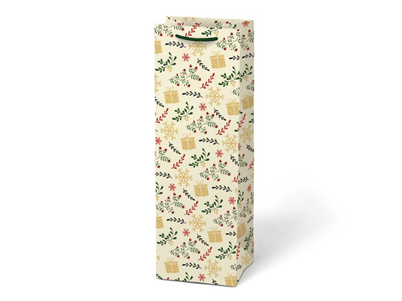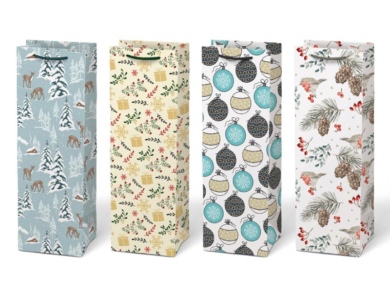 Papierová, darčeková taška na víno alebo inú fľaštičku s vianočnými motívmi. Taška je opatrená pevným uchom. Rozmer: 120 x 360 x 100 mm Motív: mix vianočných motívov Dodávame v mixe 4 ks podľa skladových zásob. Uvedená cena je za 1 ks.