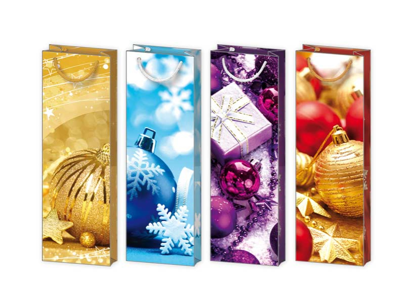 Papierová, vianočná, darčeková taška s vianočnými motívmi. Ideálna taška na fľašu vína alebo inú fľašu. Taška má pevné ucho na ľahšie prenášanie a štítok na vpísanie mena alebo priania. Povrchová úprava: Lak Rozmery: 120 x 370 x 90 mm Dodávame v mixe po 4 ks podľa skladových zásob. Uvedená cena je za 1 ks.