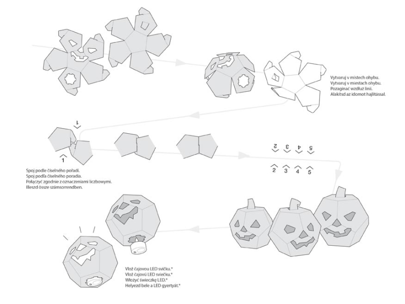 Súprava skladacích papierových tekvíc. Poskladajte si tú pravú „helloweenskú“ ozdobu, svietiacu tekvicu. Zostavenie je veľmi jednoduché a nepotrebujete k tomu žiadne nástroje. Jedna tekvica sa skladá z dvoch častí. Po zložení vložte do pripraveného otvoru čajovú elektrickú sviečku, ktorá dodá tú správnu atmosféru. BALENIE OBSAHUJE: - 3 kusy tekvíc rôznych veľkostí (S - 13 cm, M - 14 cm, L - 15 cm) VAROVANIE: - použitie iba s LED sviečkou na batérie (max. 3V) - sviečka nie je súčasťou balenia Uvedená cena je za 1 ks.