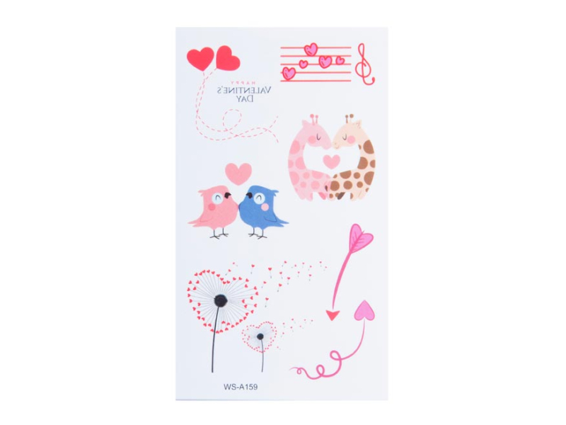Tetovacie obtlačky - láska. Vytvorte si originálne tetovanie pomocou tetovačiek! NÁVOD: 1. Vystrihnite zvolený motív a odstráňte kryciu fóliu. 2. Obrázok pritlačte na čistú suchú pokožku. 3. Zhora vodou navlhčite podkladový papier obrázka, pridržte 20 sekúnd na pokožke a potom ho opatrne snímte. 4. Obrázok nechajte 60 sekúnd zaschnúť. Tetovanie je možné odstrániť pomocou liehu, krému, bežným umývaním alebo detským olejčekom. Uvedená cena je za 1 aršík.