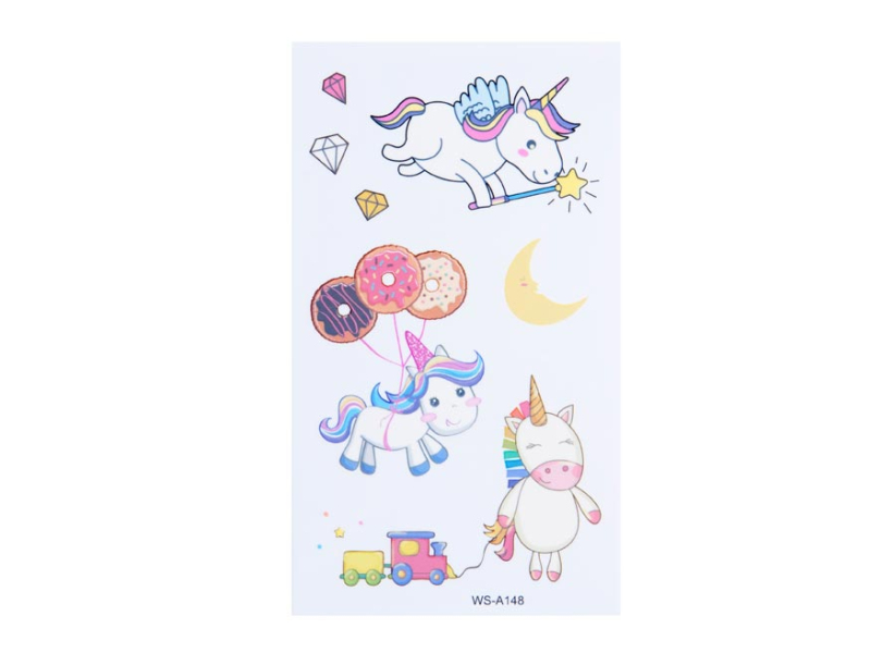 Tetovacie obrisky - jednorožce. Tetovacie obtlačky s motívom jednorožcov. Sú vhodné na detské oslavy, párty, karnevaly alebo ako darček priateľom. NÁVOD: 1. Vystrihnite zvolený motív a odstráňte kryciu fóliu. 2. Obrázok pritlačte na čistú suchú pokožku. 3. Zhora vodou navlhčite podkladový papier obrázka, pridržte 20 sekúnd na pokožke a potom ho opatrne snímte. 4. Obrázok nechajte 60 sekúnd zaschnúť. Tetovanie je možné odstrániť pomocou liehu, krému, bežným umývaním alebo detským olejčekom. Uvedená cena je za 1 aršík.