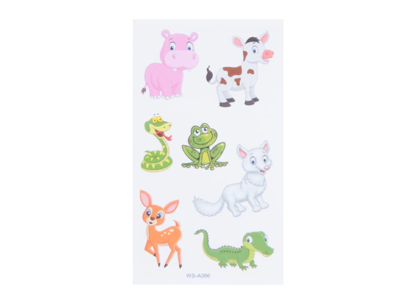 Tetovacie obtlačky - veselé zvieratká. Tetovacie obtlačky s motívmi veselých zvieratiek. Sú vhodné na detské oslavy, párty, karnevaly alebo ako darček priateľom. NÁVOD: 1. Vystrihnite zvolený motív a odstráňte kryciu fóliu. 2. Obrázok pritlačte na čistú suchú pokožku. 3. Zhora vodou navlhčite podkladový papier obrázka, pridržte 20 sekúnd na pokožke a potom ho opatrne snímte. 4. Obrázok nechajte 60 sekúnd zaschnúť. Tetovanie je možné odstrániť pomocou liehu, krému, bežným umývaním alebo detským olejčekom. Uvedená cena je za 1 aršík.