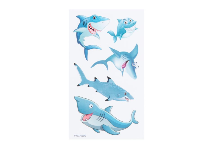 Tetovacie obtlačky - veselé žraloky. Tetovacie obtlačky s motívom veselých žralokov. Sú vhodné na detské oslavy, párty, karnevaly alebo ako darček priateľom. NÁVOD: 1. Vystrihnite zvolený motív a odstráňte kryciu fóliu. 2. Obrázok pritlačte na čistú suchú pokožku. 3. Zhora vodou navlhčite podkladový papier obrázka, pridržte 20 sekúnd na pokožke a potom ho opatrne snímte. 4. Obrázok nechajte 60 sekúnd zaschnúť. Tetovanie je možné odstrániť pomocou liehu, krému, bežným umývaním alebo detským olejčekom. Uvedená cena je za 1 aršík.