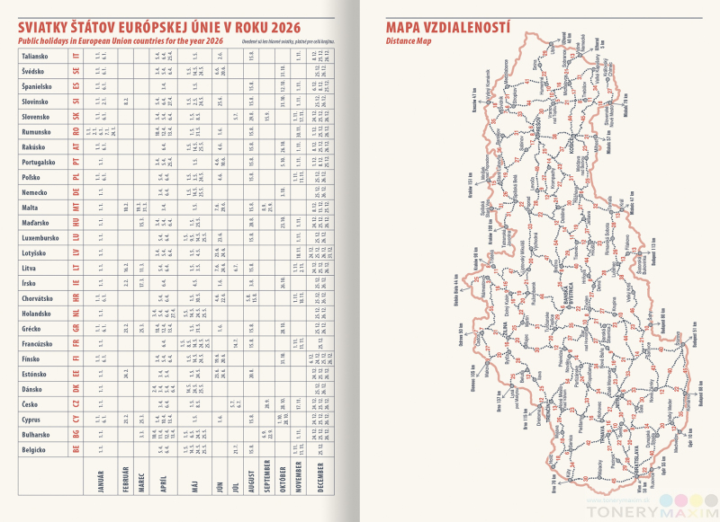 Týždenný diár s listami z krémového papiera vo fomráte B5 s hodinovým delením (7:00 - 19:00) obsahuje slovenské a české kalendárium, anglický preklad mesiacov a dní, informácie o štátnych sviatkoch všetkých krajín EÚ, prehľadný a plánovací kalendár (fond pracovného času), školské prázdniny, prehľad slovenských EČV, adresár. Ponúka dostatočný priestor pre písanie poznámok a pripomienok.