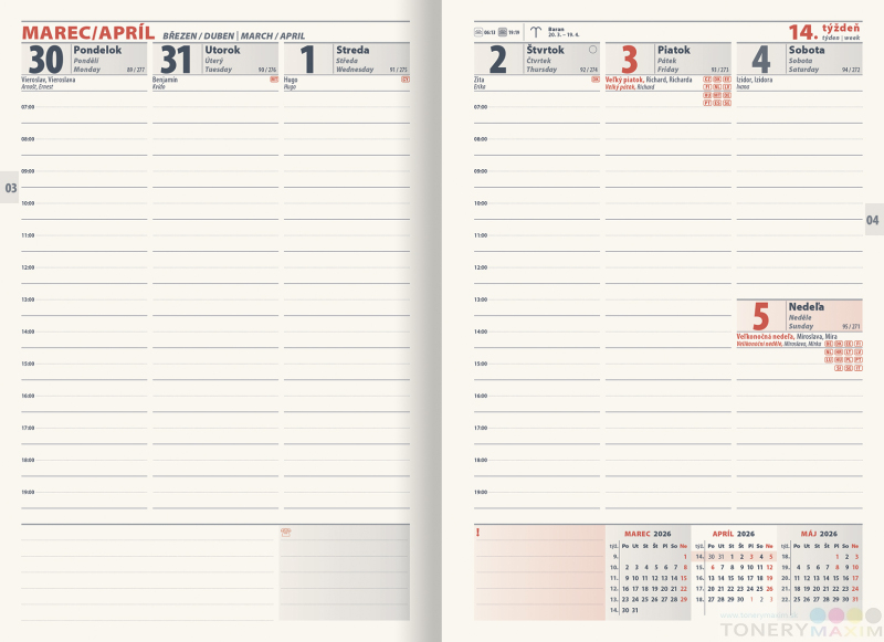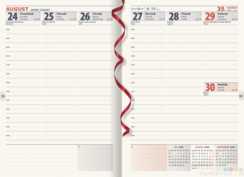 Týždenný diár s listami z krémového papiera vo fomráte B5 s hodinovým delením (7:00 - 19:00) obsahuje slovenské a české kalendárium, anglický preklad mesiacov a dní, informácie o štátnych sviatkoch všetkých krajín EÚ, prehľadný a plánovací kalendár (fond pracovného času), školské prázdniny, prehľad slovenských EČV, adresár. Ponúka dostatočný priestor pre písanie poznámok a pripomienok.