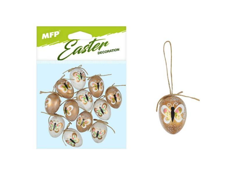 Plastové vajíčka v bielozlatej farbe na zavesenie. Krásna veľkonočná dekorácia z posypaných veľkonočných vajíčok s motýlikmi s prírodným povrázkom na zavesenie poslúži ako dekorácia do exteriéru alebo interiéru. Nalaďte sa s nami na Veľkú noc! Balenie obsahuje: - 12 ks dekorácií (vajíčka) Veľkosť: 4 cm Dekorácia má šnúrku na zavesenie. Uvedená cena je za 1 balenie.