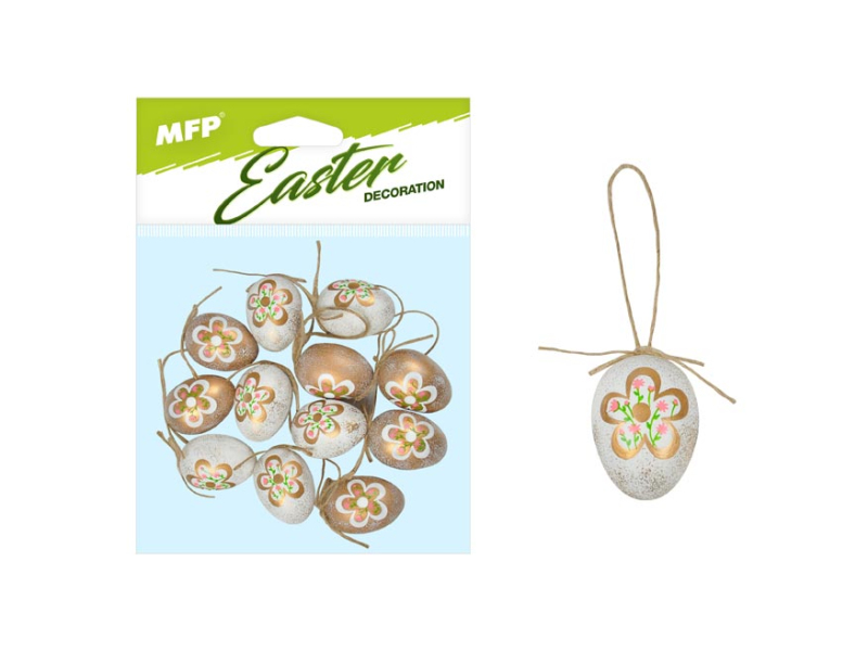Plastové vajíčka v bielozlatej farbe na zavesenie. Krásna veľkonočná dekorácia z posypaných veľkonočných vajíčok s motýlikmi s prírodným povrázkom na zavesenie poslúži ako dekorácia do exteriéru alebo interiéru. Nalaďte sa s nami na Veľkú noc! Balenie obsahuje: -12 ks dekorácií (vajíčka) Veľkosť: 4 cm Dekorácia má šnúrku na zavesenie. Uvedená cena je za 1 balenie.