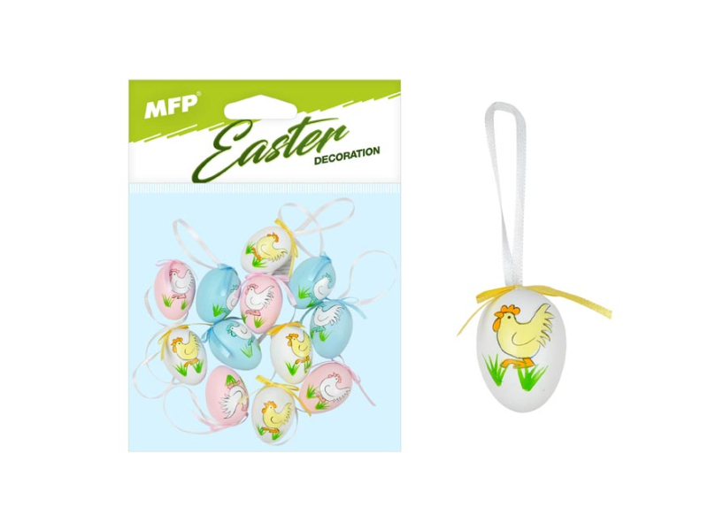 Plastové vajíčka v jarných farbách na zavesenie. Krásna veľkonočná dekorácia farebných vajíčok s kohútikom a stuhou na zavesenie. Poslúži ako dekorácia do exteriéru alebo interiéru. Dekorácia má povrázok na zavesenie. Nalaďte sa s nami na Veľkú noc! Balenie obsahuje: - 12 ks plastových vajíčok Motív: kohút Veľkosť: 40 mm Farba: biela, modrá, ružová Dodávame v sáčku so závesom. Uvedená cena je za 1 balenie.