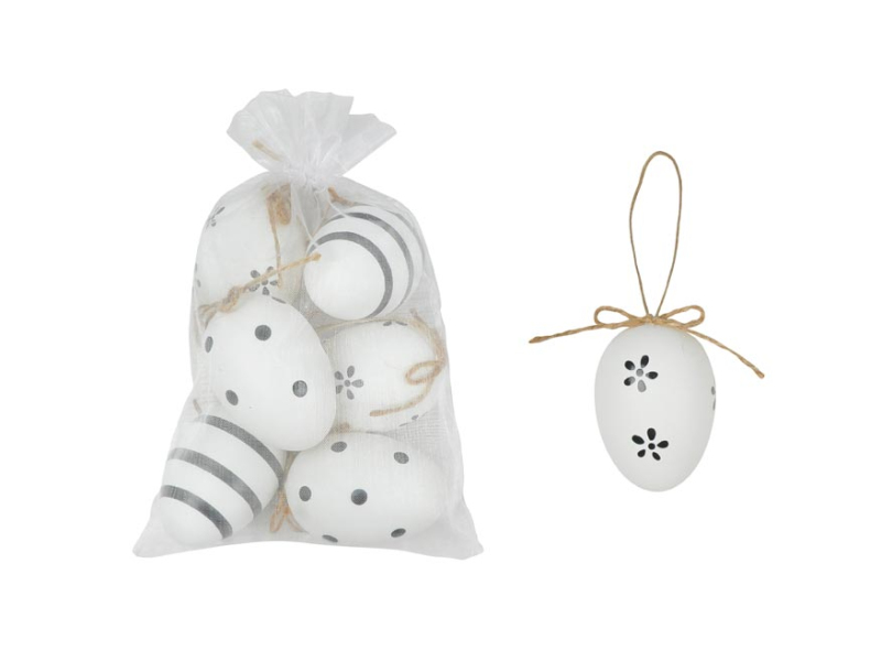 Plastové vajíčka v bieločiernej farbe na zavesenie. Krásna dekorácia veľkonočných vajíčok so zavesením, slúži ako dekorácia do exteriéru alebo interiéru. Nalaďte sa s nami na Veľkú noc! Balenie obsahuje: - 6 ks dekorácií (vajíčka) Veľkosť: 6 cm Dekorácia má šnúrku na zavesenie. Uvedená cena je za 1 balenie.